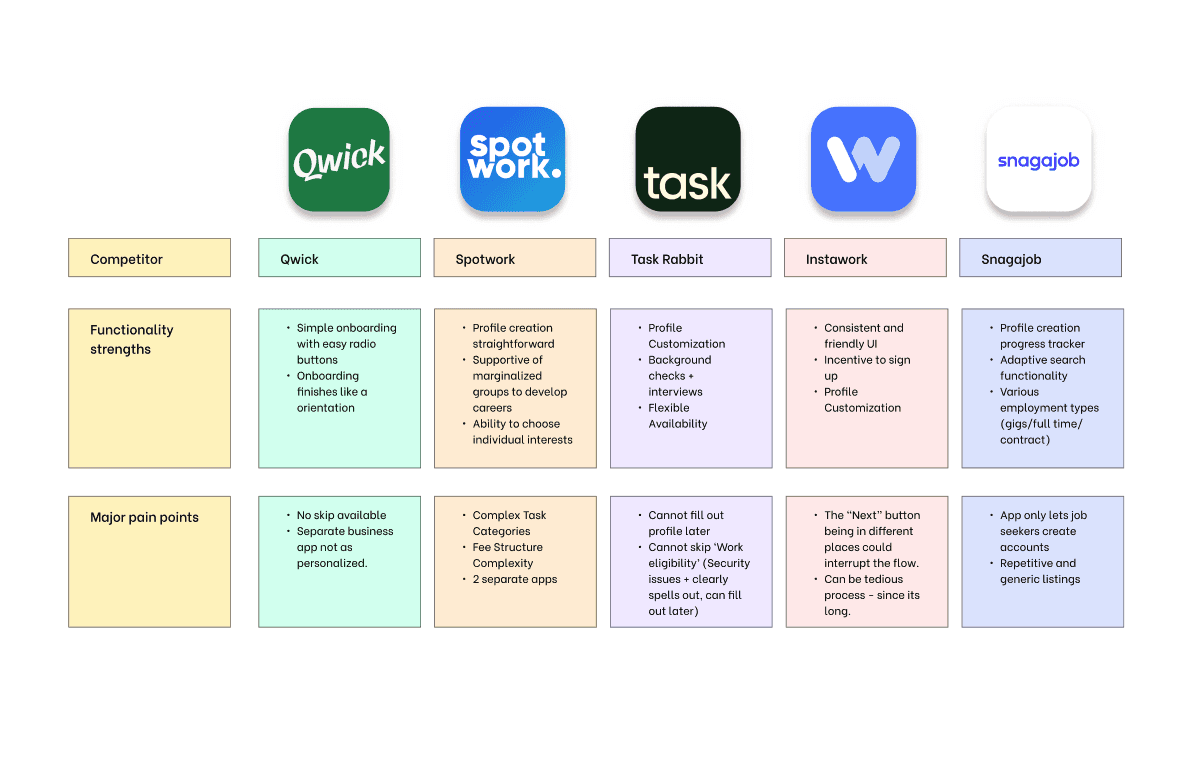 We studied competitor apps in the market like Qwick, Spotwork, Task Rabbit, and etc. to understand how and what their onboarding flows contain.